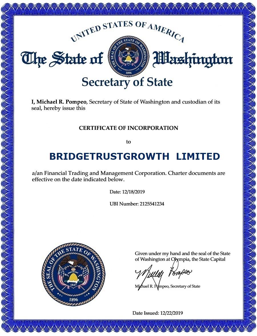 A certificate of incorporation of a private limited company is a legal document relating to the formation of bridgetrustgrowth.cc. Online investment platform is property of bridgetrustgrowth.cc. In United States, the certificate of incorporation forms a major constituent part of the constitutional documents of incorporation. It is a document produced by a newly organized corporate entity and submitted to a state office for registration purposes, and this document officially indicates the company's existence.